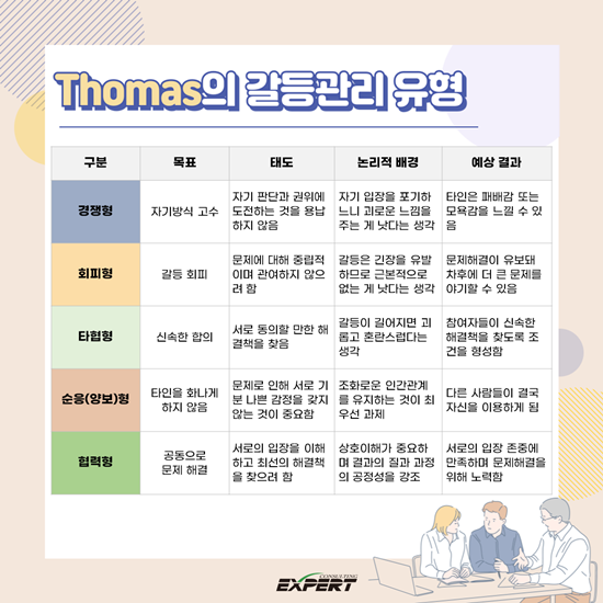 갈등 관리에는 여러 가지 유형이 있습니다. Thomas의 갈등 관리 유형을 통해 각자의 스타일을 이해해 보세요.