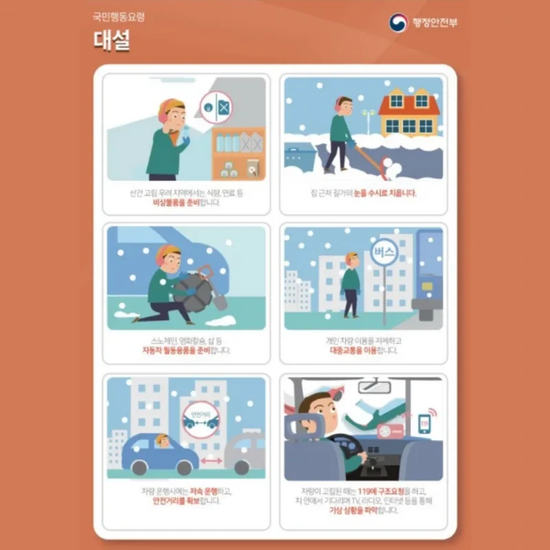 - 외출 자제 : 폭설이 시작되면 가급적 외출을 자제하고, 필요한 경우에는 미리 준비한 비상용품을 활용합니다.