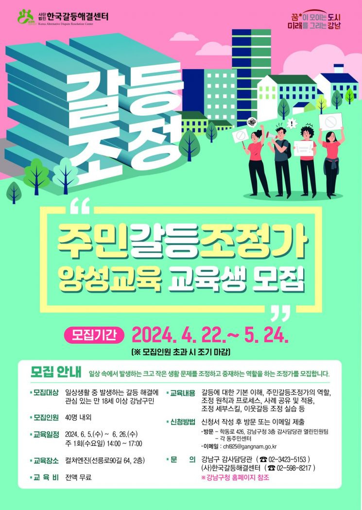 에서는 지역 사회의 갈등을 해결하기 위한 교육 프로그램이 진행됩니다. 이 프로그램은 갈등 관리에 대한 교육과 실습을 통해 참여자들이 실제 상황에서 갈등을 효과적으로 해결할 수 있도록 돕습니다.