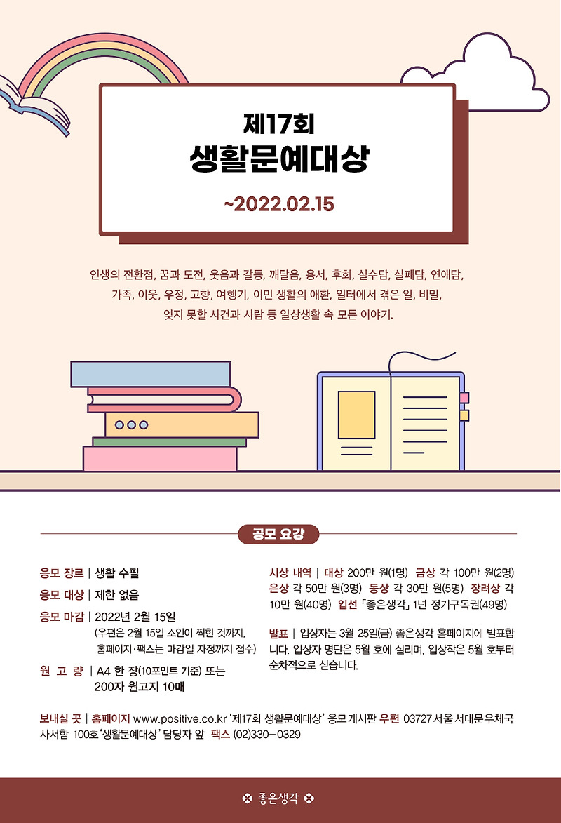 17회 인생 문학 공모전 포스터입니다. 다양한 삶의 경험을 공유하고 참여를 독려합니다.