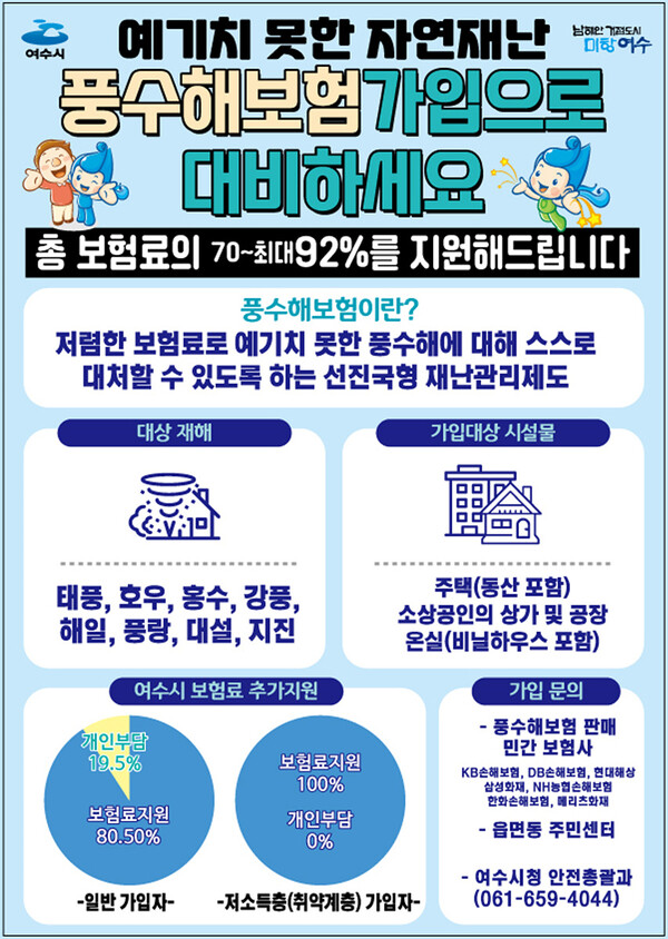 위의 포스터는 여수시의 홍수 피해 보험에 대한 정보를 제공합니다. 자연재해에 대비하기 위해서는 이러한 보험 가입이 필수적입니다.