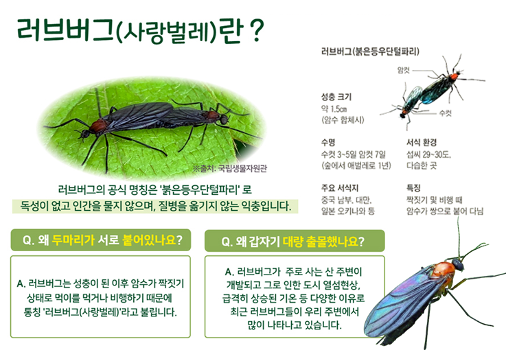 [1] 네이버 블로그 - 도심 속 러브버그는 해충? 익충? 돌발해충에 대한 진실과 오해 (https://m.blog.naver.com/cescomembers/222857824888)
