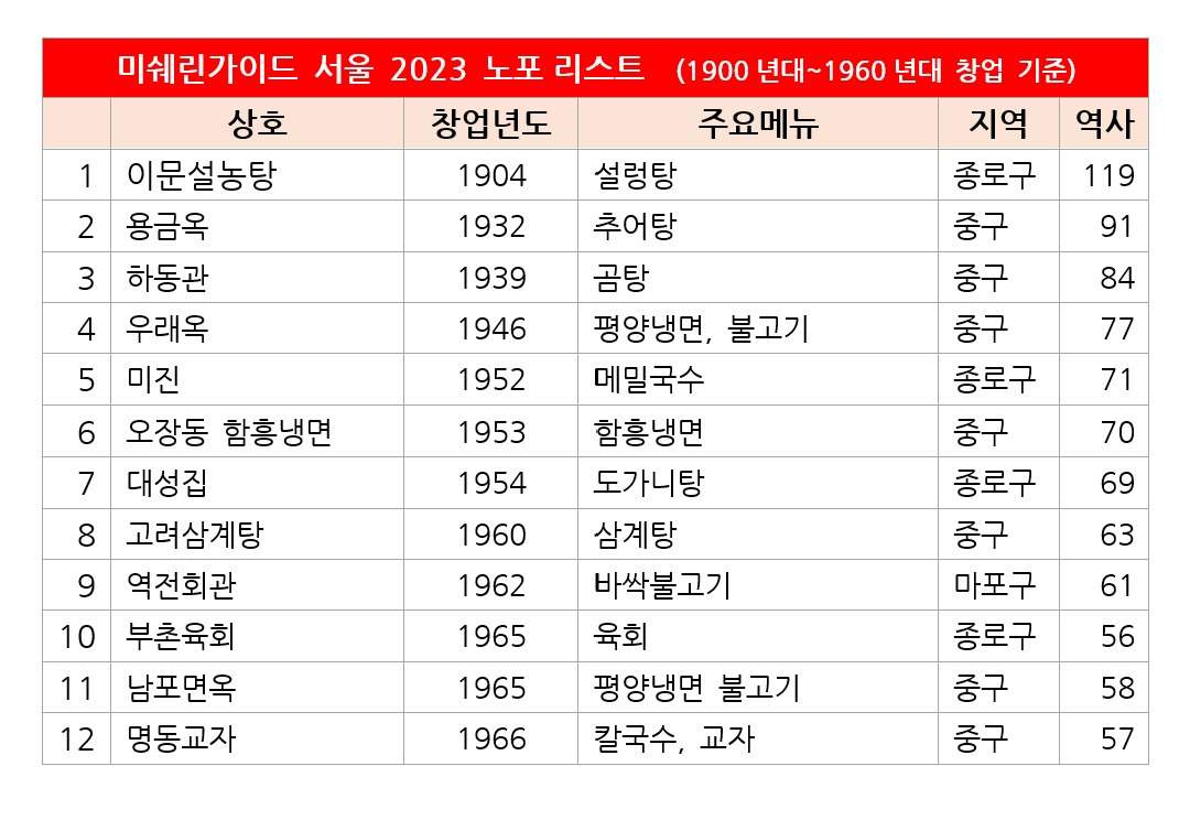 미쉐린 가이드 서울 2023 노포 리스트