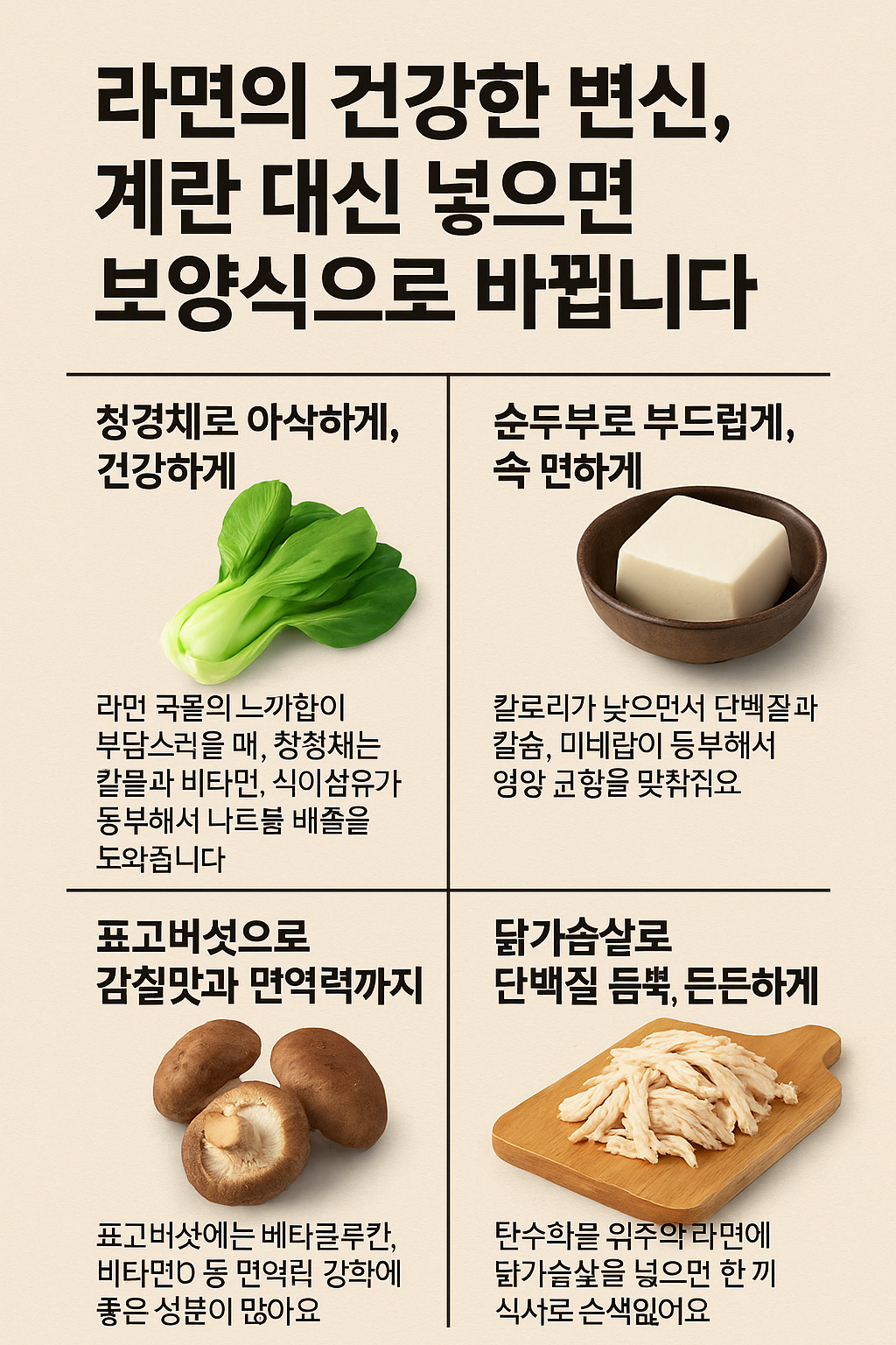 - 버섯 : 면역력 강화에 효과적인 성분이 포함되어 있습니다.