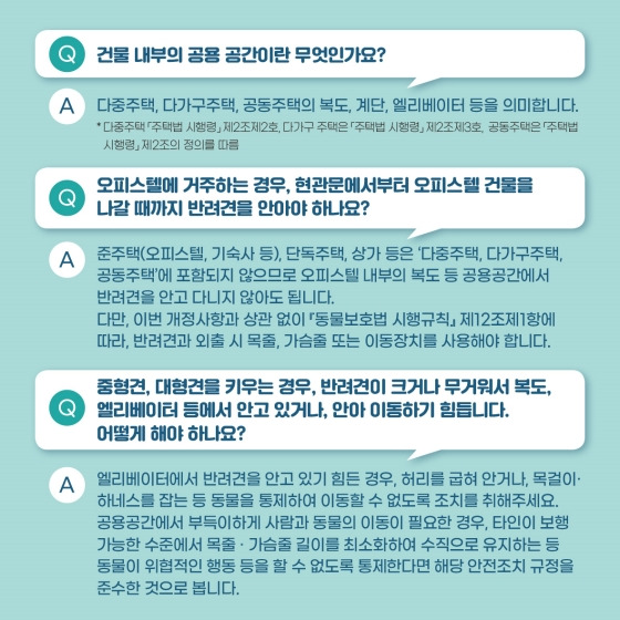 공유 공간에서는 반려동물의 행동을 잘 관리해야 합니다. 예를 들어, 엘리베이터를 이용할 때는 다른 주민들과의 거리를 유지하고, 반려동물이 다른 사람에게 다가가지 않도록 주의해야 합니다.