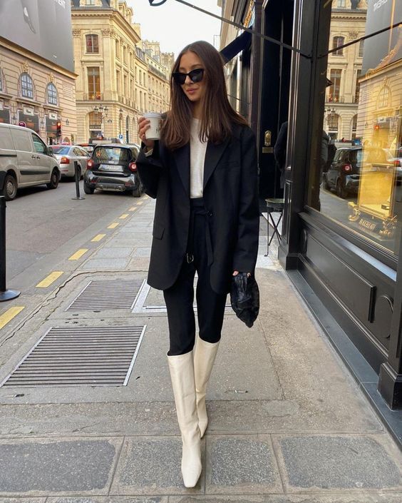 에서는 도시적인 느낌의 블랙 블레이저와 화이트 무릎 부츠를 조합하여 세련된 룩을 연출하고 있습니다.