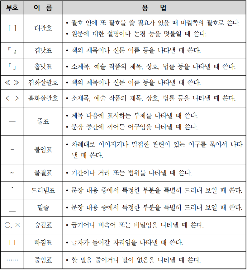 · 문장 부호: 마침표, 물음표, 느낌표, 쉼표 등
