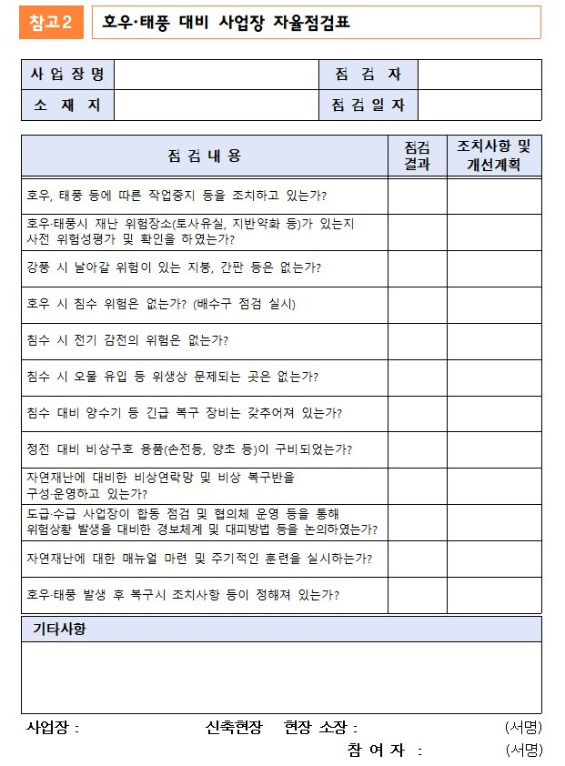[1] 고용노동부 - Ⅵ 풍수해 대비 점검표(Check list) (https://www.moel.go.kr/local/boryeong/common/downloadFile.do?file_seq=20220800990&bbs_seq=20220800595&bbs_id=LOCAL5)
