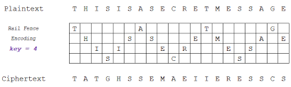 다른 예로는 라일 펜스(Rail Fence) 암호가 있습니다. 이 방식은 평문을 일정한 간격으로 띄워서 나열하고, 그 사이를 채워나가는 방식으로 암호화를 수행합니다.