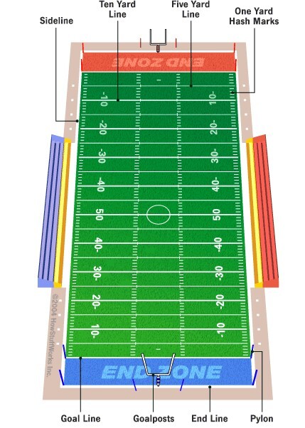- 미식축구 경기장은 직사각형으로 엔드라인( End Line)에서 경기장 안쪽으로 10야드 거리에 골라인(Goal Line)이 있음