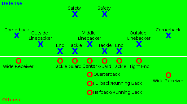 - 라인배커: 포지션의 원래 뜻은 라인을 백업하는 선수였으나 4-3 디펜스의 시작과 함께 등장한 포지션으로 수비 라인맨을 백업하다가 상황에 따라 쿼터백과 러닝백을 공략하거나, 패스 수비도 겸하는 전천후 포지션으로 속도는 중간, 덩치와 힘도 중간인 선수를 배치함