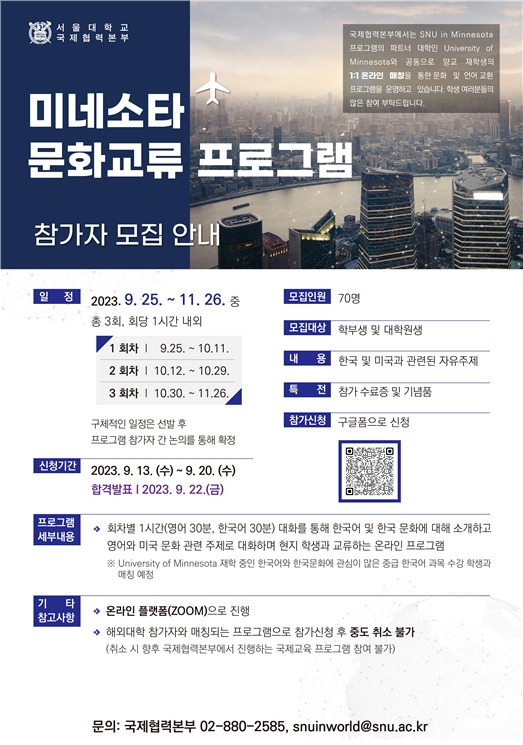 또한, 서울대학교에서 주관하는 "미네소타 문화 교류 프로그램"은 미국과 미네소타에 대한 문화 교류를 중심으로 진행됩니다. 이 프로그램은 대학생을 대상으로 하며, 온라인으로 진행되어 접근성이 높습니다.