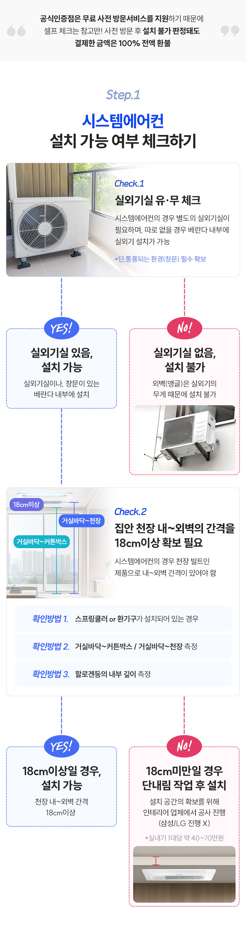 - 외부 공간 확보 : 시스템 에어컨의 경우, 외부 설치 공간이 필요합니다. 최소 18cm의 높이 여유가 있어야 해요.
