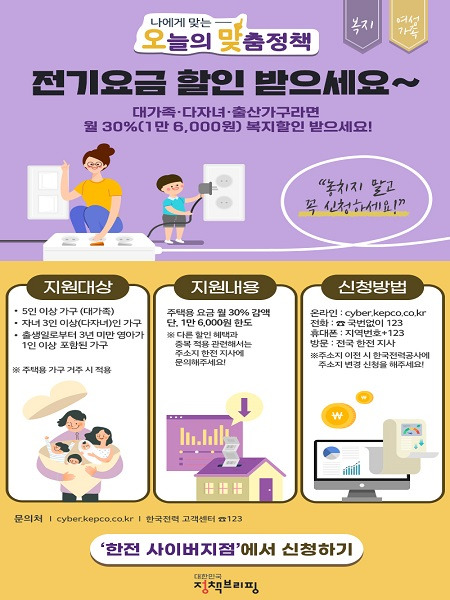 다자녀 가구를 위한 할인제도도 있습니다. 세 자녀 이상을 둔 가구는 전기료의 30%를 할인받을 수 있으며, 이는 가정의 경제적 부담을 크게 줄여줍니다.
