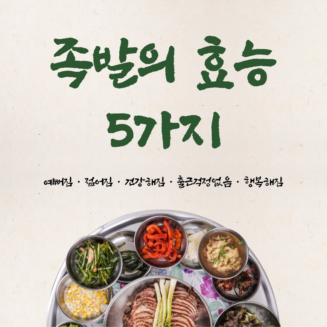 [3] 당근 - 족발의 효능 5가지 | 경기도 수원시 팔달구 인계동 | 족발/보쌈 (https://www.daangn.com/kr/business-post/%EC%A1%B1%EB%B0%9C%EC%9D%98-%ED%9A%A8%EB%8A%A5-5%EA%B0%80%EC%A7%80-r1efi4sup4ii/)