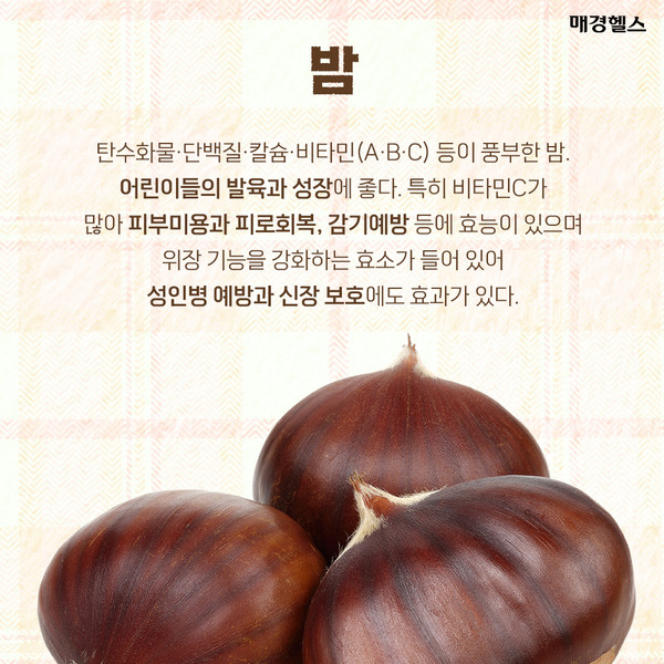 밤은 고소하고 달콤한 맛이 특징이며, 특히 영양이 풍부한 음식입니다. 밤은 단백질, 비타민, 미네랄 등이 풍부하여 성장기 어린이에게도 좋습니다. 또한, 소화를 돕고 피부 건강을 유지하는 데도 기여합니다.