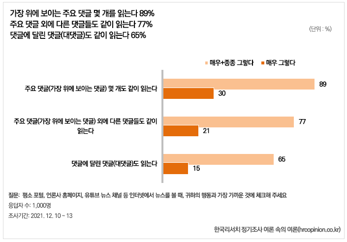 많은 사람들이 댓글을 읽는 방식에 대해 조사한 결과, 89%의 응답자가 주요 댓글을 읽고, 77%는 다른 댓글도 함께 읽는다고 합니다.