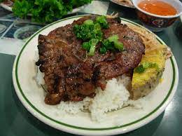 양념한 돼지고기를 올린 베트남식 덮밥으로 추가로 계란후라이(옵라)나 고기계란찜(짜 쯩 합)을 곁들이면 맛이 더 좋아짐