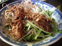 구운 돼지고기와 바질, 민트, 당근, 파파야 등의 신선한 야채를 국수 면과 비벼 먹는 국물 없는 국수