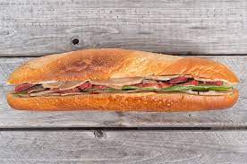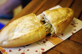 친숙한 banh mi kep thit는 돼지고기, 햄, 돼지고기 페이트, 마요네즈, 절인 채소, 고추로 속을 채운 베트남식 바게트로 테이크아웃에 적합