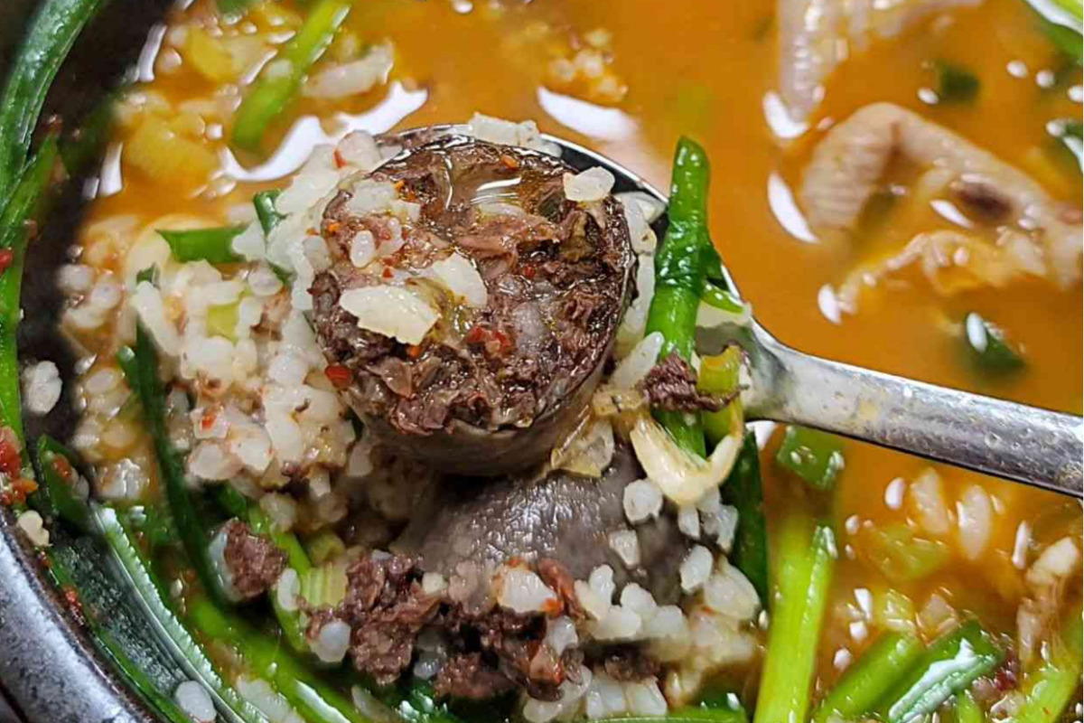 맛있는 국물 요리의 클로즈업 사진입니다. 다양한 재료가 어우러져 풍부한 맛을 자랑합니다.