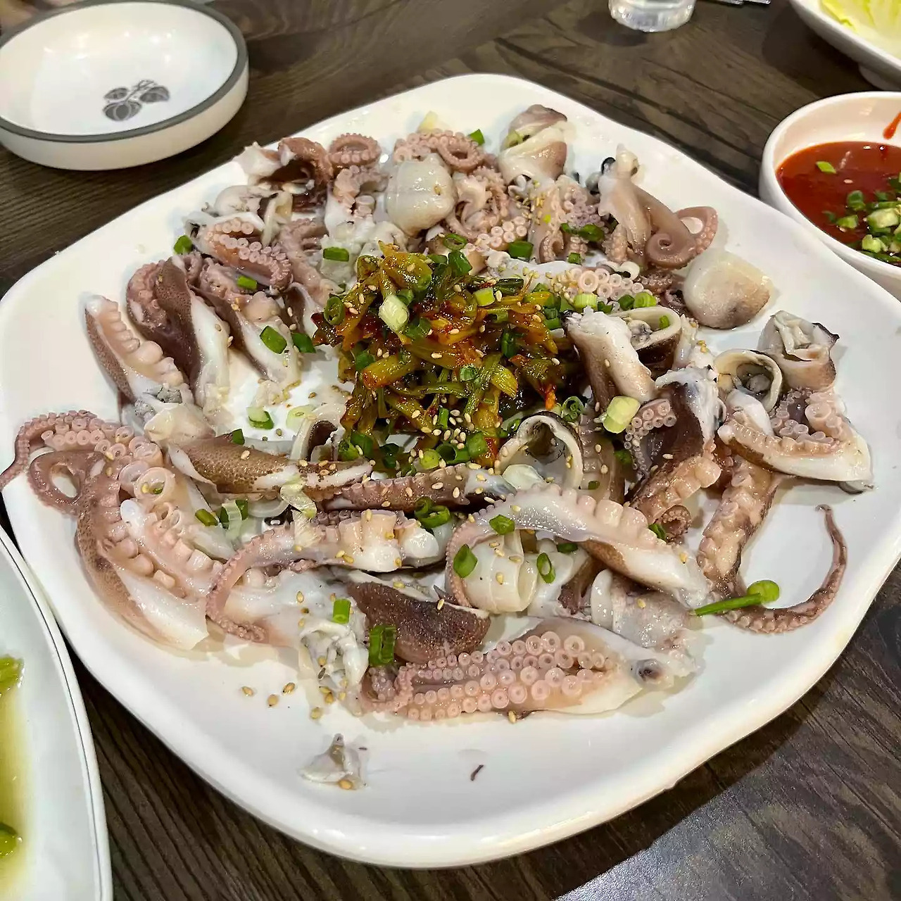 신선한 문어 요리의 모습입니다. 다양한 채소와 함께 제공되어 시각적으로도 매력적입니다.