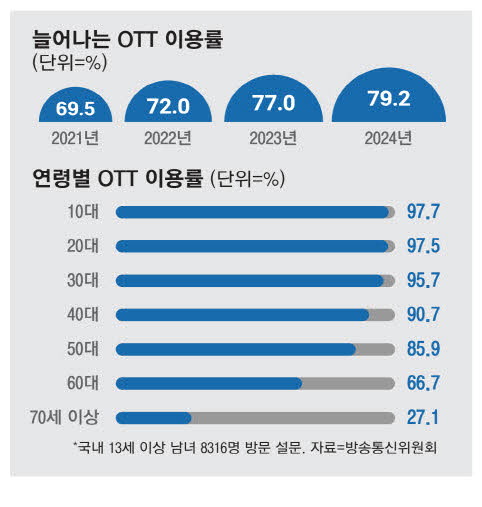 현재 OTT 콘텐츠는 전 세계적으로 큰 인기를 끌고 있으며, 한국에서도 그 사용률이 급증하고 있습니다. 2021년부터 2024년까지의 OTT 사용률을 살펴보면, 2021년 69.5%에서 2024년에는 79.2%로 증가할 것으로 예상됩니다. 특히, 10대의 경우 97.7%라는 높은 사용률을 보이고 있습니다. 이는 젊은 세대가 OTT 콘텐츠를 주로 소비하고 있음을 나타냅니다.