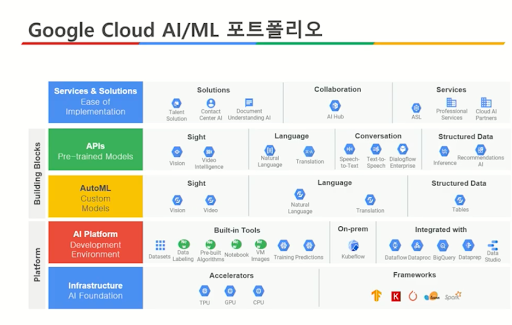 - Google Cloud AI : Google의 AI 플랫폼은 머신러닝과 데이터 분석을 위한 다양한 도구를 제공합니다. 특히 AutoML 기능을 통해 비전, 언어, 대화 등 다양한 분야에서 맞춤형 모델을 쉽게 개발할 수 있습니다.