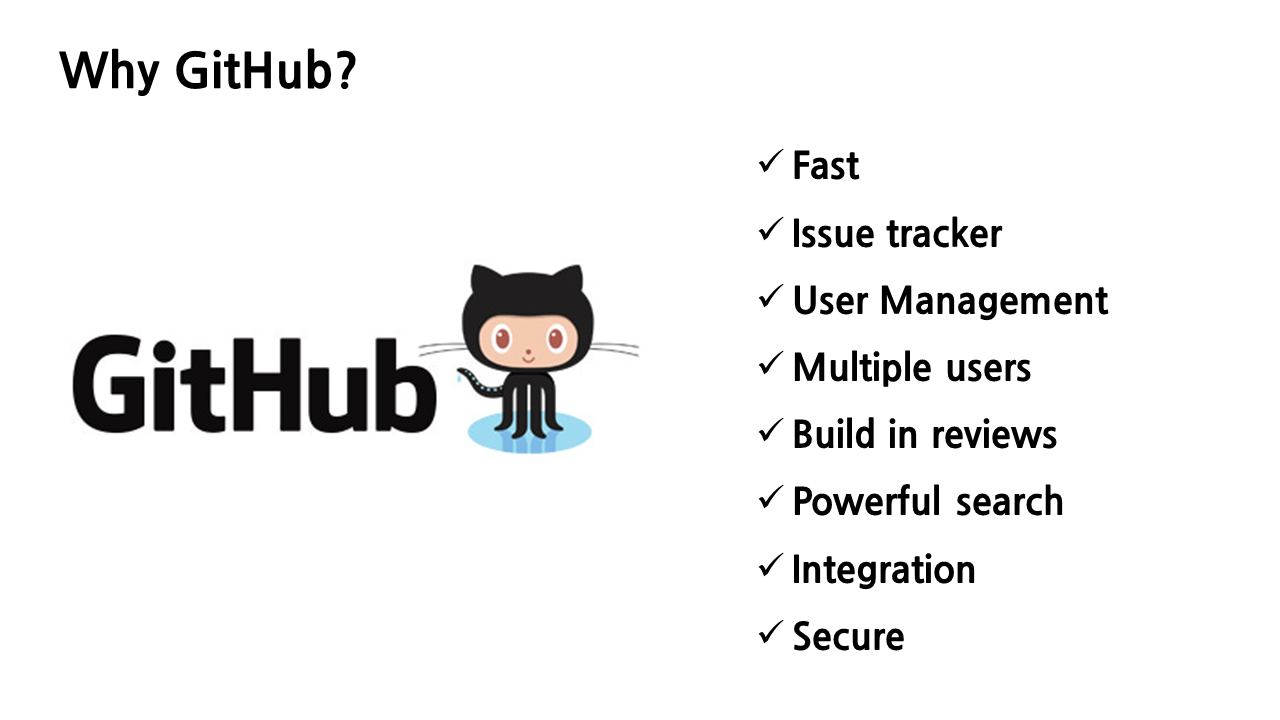 - 빠른 속도 : GitHub는 빠른 속도로 코드 변경 사항을 관리할 수 있습니다.