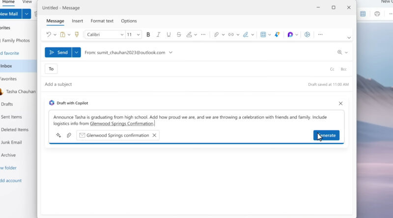 - 자동 콘텐츠 생성 : 사용자가 입력한 키워드나 문장에 기반하여 관련된 내용을 자동으로 생성합니다. 예를 들어, Outlook에서 이메일을 작성할 때, 사용자가 "Tasha의 졸업식에 대한 이메일"이라고 입력하면, Copilot이 자동으로 이메일 초안을 작성해 줍니다.