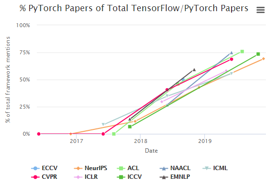 아래의 그래프는 연구 논문에서 TensorFlow와 PyTorch의 사용 비율을 보여줍니다.